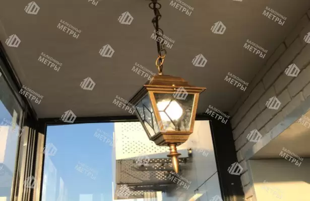 Отделка балкона панелями ПВХ и ламинат и установка кованого настенного плафона